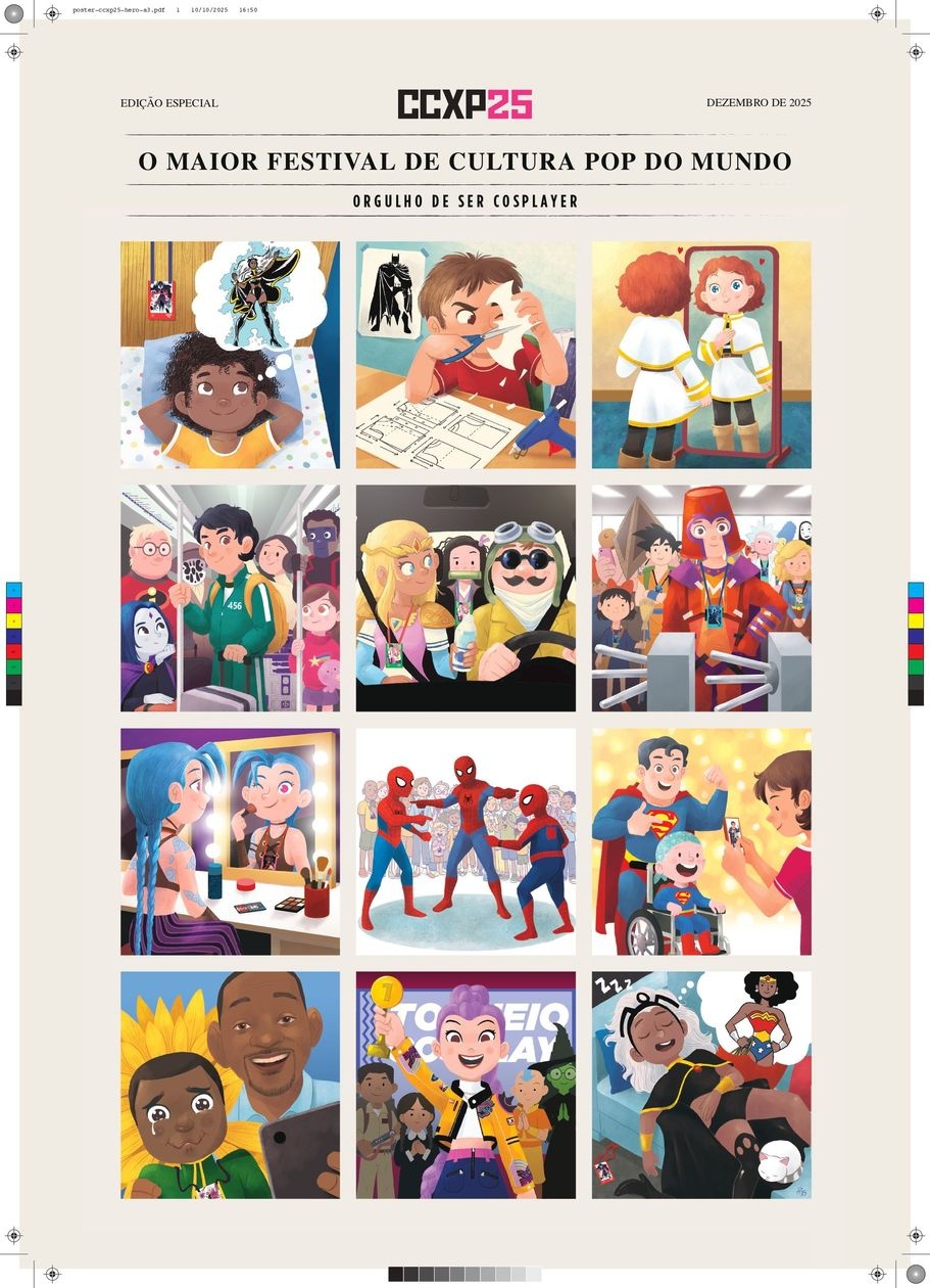 São Paulo, 24 de outubro de 2025- A CCXP25 revela o pôster oficial desta edição com uma homenagem direta aos cosplayers, uma das principais comunidades do festival. A peça, assinada pelo ilustrador e diretor de arte Hiro Kawahara, vencedor da medalha de ouro do 18º Japan International Manga Awards, é o primeiro pôster da CCXP produzido no formato de história em quadrinhos. Ele estará no Artists’ Valley, de 4 a 7 de dezembro, para encontrar fãs, autografar suas HQs e compartilhar suas histórias como ilustrador e quadrinista.