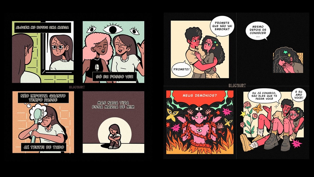 03.12 (Quarta) | 04.12 (Quinta) | 05.12 (Sexta) | 06.12 (Sábado) | 07.12 (Domingo)Oi, sou a Bianca, mas pode me chamar de Bi! Me especializei em ilustração infantil e trabalhei em animações como Valoriant, Rick and Morty, Polly Pocket e Iuri Iudi. Nos livros, ilustrei Beacky's SOS e Samba de uma flauta só. Atualmente atuo na Editora Etapa com materiais didáticos, mas minha paixão é criar quadrinhos e webtoons. Publiquei A Lenda de Grins em 2018, participei das antologias Mundos em Miniaturas e Longe de Casa, formei-me em roteiro em 2022 e sigo lançando trabalhos autorais. Em 2025 lancei a zine Escárnio e na CCXP apresento a HQ Refúgio. Paralelamente, produzo de forma independente Krista, um dark romance sobre ego e amor.